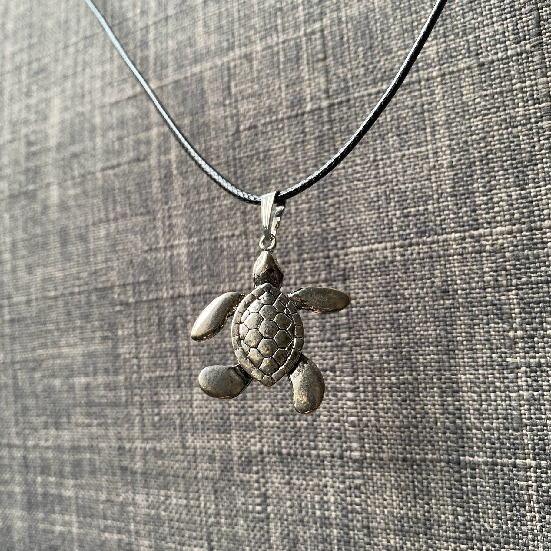 Collar de tortuga en aleación metálica plateada. Cadena simil piel negra de 43cm con extensión de 5cm para regular el largo. Tamaño del dije: 23mm x 23mm.