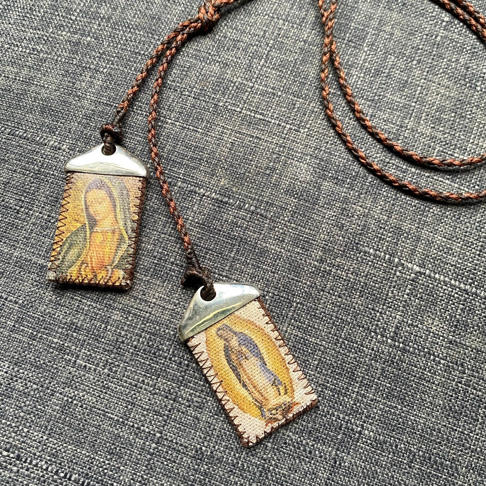 Escapulario doble hecho a mano con imágenes estampadas en manta, montadas en plata.925, con cordón de hilo tejido en macramé. Imagen: Virgen de Guadalupe. Circunferencia del cordón: 66cm (más 16cm del colgante). Tamaño de cada escapulario: 45mm x 25mm.